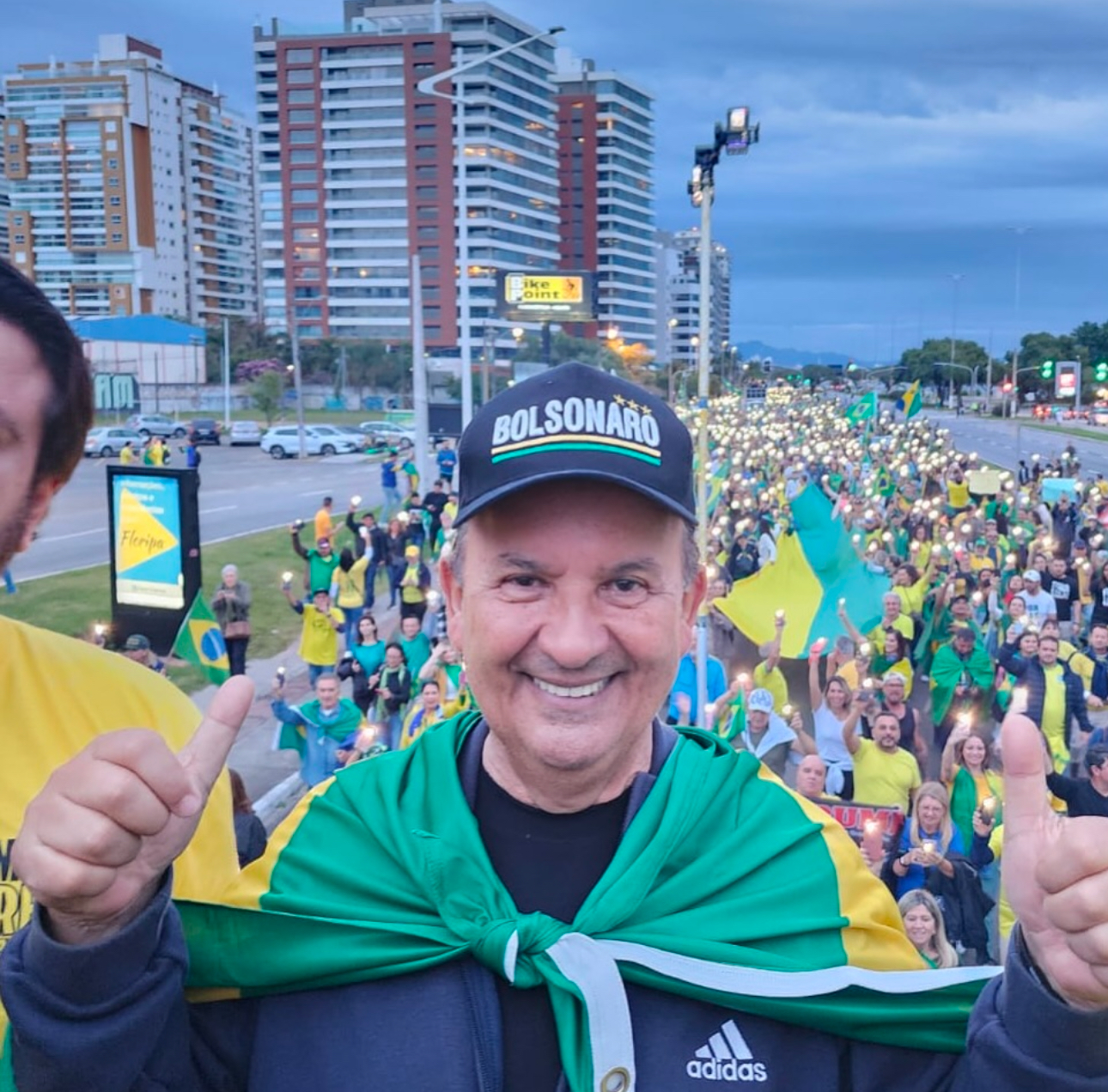 O governador de Santa Catarina, Jorginho Mello (PL), marcou presença em uma das manifestações realizadas neste domingo (3) em várias cidades do Brasil. Em Florianópolis, ele subiu em um trio elétrico, usando um boné com o nome “Bolsonaro”, e demonstrou apoio ao movimento que pede anistia aos presos pelos atos do 8 de janeiro de 2023.