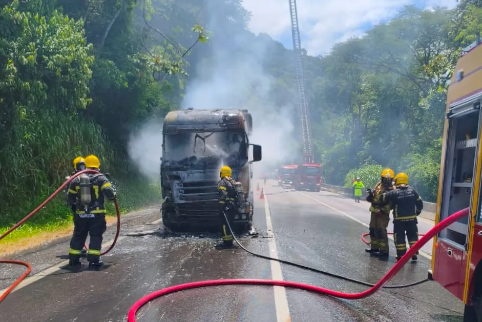 A ocorrência foi registrada por volta das 12h18 e envolveu um caminhão Scania que já estava completamente tomado pelas chamas no momento da chegada das guarnições. Diante da gravidade da situação e do risco envolvido, a rodovia foi totalmente bloqueada para garantir a segurança das equipes e dos usuários da via.