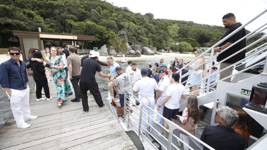 A icônica Praia do Pinho, a primeira de nudismo no Brasil, e o Caixa D’Aço, reduto de badalação no verão, estão no trajeto, embora o catamarã não pare nelas. E enquanto se encanta com os cenários, o turista tem serviço de bar, com garçons atendendo o público.